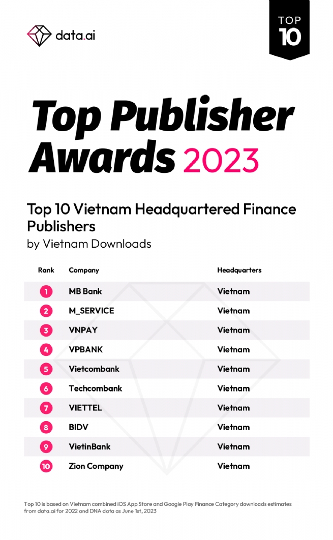 Đại diện data.ai cho biết, top 10 được xếp hạng dựa trên hai chỉ số, bao gồm thống kê của data.ai về số lượt tải các ứng dụng tài chính trên iOS App Store và Google Play trong năm 2022 và số liệu DNA tính đến ngày 1/6/2023.