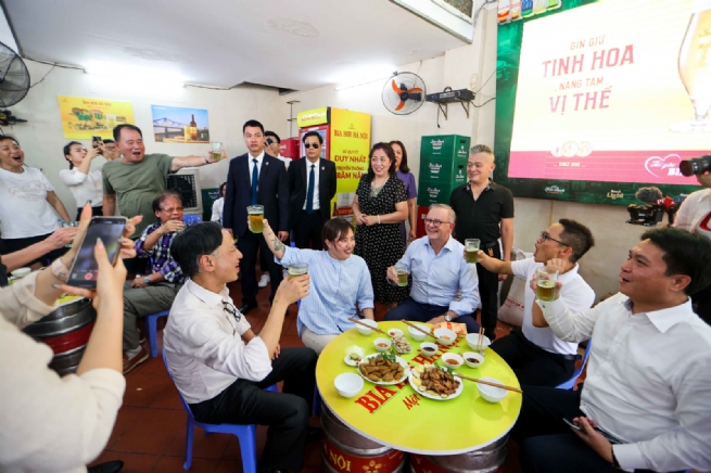 Thủ tướng Australia Anthony Albanese (ngồi giữa) cùng mọi người thưởng thức bia hơi Hà Nội trong chuyến thăm Việt Nam vào ngày 03/6/2023