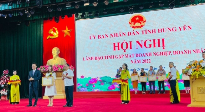 Bà Nguyễn Thu Hà, Giám đốc HABECO-ID đón nhận danh hiệu Doanh nghiệp - Doanh nhân tiêu biểu đóng góp tích cực cho sự nghiệp phát triển kinh tế - xã hội tỉnh Hưng Yên năm 2022