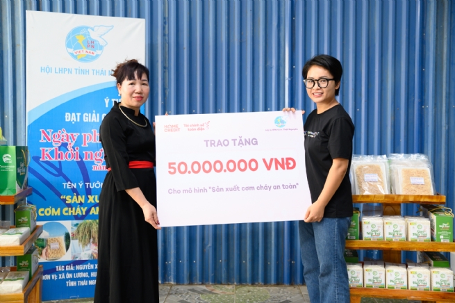 Nói đến Thái Nguyên, người ta không chỉ nói đến đặc sản chè mà còn có gạo nếp vải Ôn Lương (huyện Phú Lương). Không chỉ là nguyên liệu để nấu xôi, làm cốm non, mà gạo nếp vải Ôn Lương dưới sự sáng tạo của chị Nguyễn Xuân Huế (người dân tộc Tày tại xã Ôn Lương, huyện Phú Lương) đã trở thành nguyên liệu để cho ra đời những tấm cơm cháy thơm ngon. Sáng kiến này đã đoạt giải Nhì cuộc thi “Phụ nữ khởi nghiệp tỉnh Thái Nguyên năm 2022”. Sáng kiến đã có tác động lan toả tích cực đến cộng đồng khi chị Huế đứng lên vận động nhiều chị em lớn tuổi ở cùng thôn tham gia các công đoạn sản xuất cơm cháy, giúp các chị em nghèo trong thôn có công ăn việc làm và thêm một phần thu nhập để dần thoát nghèo. Nhằm hỗ trợ chị Huế mở rộng sản xuất, quảng bá thương hiệu, Home Credit đã phối hợp với Hội Liên hiệp Phụ nữ tỉnh Thái Nguyên trao kinh phí cho chị Huế khởi nghiệp. Đây cũng là một trong 3 mô hình sản xuất rất nhỏ do phụ nữ làm chủ được Home Credit hỗ trợ vốn khởi nghiệp dịp này.