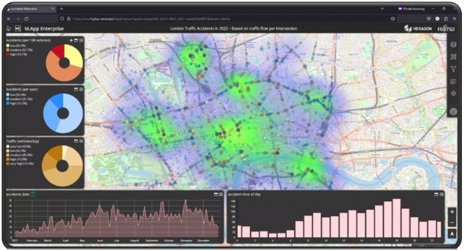 Kết hợp công cụ mô hình hoá không gian địa lý M. App Enterprise của Hexagon với các dịch vụ cơ sở hạ tầng của Fujitsu, hai doanh nghiệp đã cùng nhau phát triển một ứng dụng giúp mô hình hoá các khu vực có tỷ lệ tai nạn giao thông cao; phân tích mật độ giao thông, thiết kế đường xá, hệ thống biển báo cùng nhiều yếu tố khác; và đưa ra các gợi ý có thể giúp giảm tai nạn giao thông, căn cứ theo Bộ Công cụ An toàn Đường bộ (xem thêm Ghi chú 2) của Chương trình Đánh giá Đường bộ Quốc tế (iRAP).