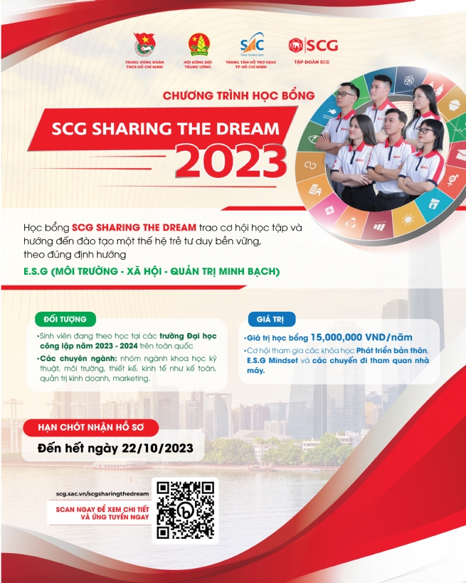 Mới đây, Trung ương Đoàn, Hội đồng Đội Trung ương phối hợp cùng tập đoàn SCG và Trung tâm Hỗ trợ Sinh viên TP.HCM (SAC) phát động triển khai học bổng SCG Sharing The Dream năm 2023 dành cho học sinh, sinh viên toàn quốc. Chương trình năm nay hướng đến hỗ trợ và đồng hành cùng 100 sinh viên đại học và 100 học sinh cả nước có ý chí vươn lên trong cuộc sống và không ngừng đóng góp cho cộng đồng thông qua các dự án về môi trường và xã hội. Với tổng giá trị học bổng lên đến 2,7 tỷ đồng cùng các chương trình đào tạo về tư duy bền vững cho sinh viên, học sinh.