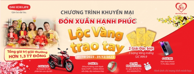 Tiếp nối chuỗi các chương trình tri ân khách hàng hấp dẫn, quy mô và xuyên suốt trong thời gian qua và hướng đến chào đón năm mới 2024 với nhiều hứng khởi và may mắn, Dai-ichi Life Việt Nam tiếp tục triển khai chương trình khuyến mại “Đón Xuân Hạnh Phúc, Lộc Vàng Trao Tay” dành cho khách hàng trên toàn quốc có hợp đồng bảo hiểm được phát hành từ ngày 1/10/2023 đến hết ngày 31/12/2023 với 50 giải thưởng hấp dẫn có tổng trị giá hơn 1,3 tỷ đồng.