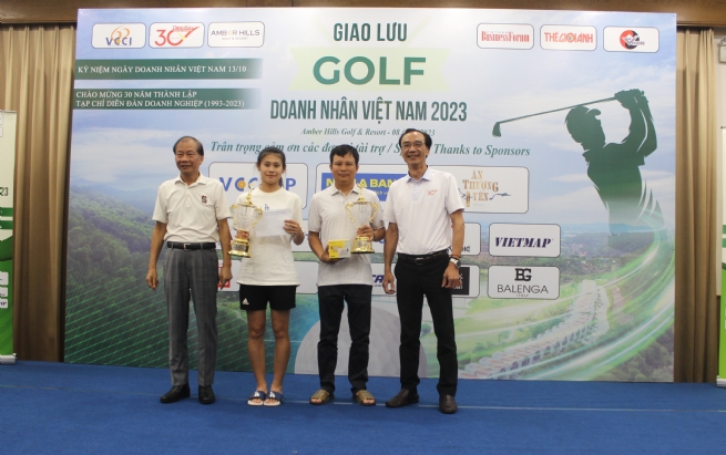 Ông Hoàng Quang Phòng - Phó Chủ tịch VCCI và ông Nguyễn Linh Anh - Phó Tổng biên tập phụ trách Tạp chí Diễn đàn Doanh nghiệp trao giải cho hai Vận động viên Vô địch Best Gross Nam và Nữ