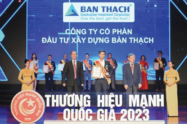 Đại diện Ban lãnh đạo Bàn Thạch nhận Huy chương vinh danh doanh nghiệp đạt Top 10 Thương hiệu mạnh Quốc gia lần thứ IV, ngày 16/4/2023