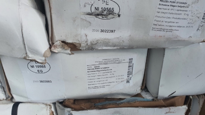 Đoàn kiểm tra tiến hành khám toàn bộ hàng hóa trên thùng xe ô tô tải đông lạnh, phát hiện trong thùng xe ô tô tải đông lạnh có 568 hộp giấy bìa chứa dạ dày lợn đông lạnh, 10 kg/hộp, bên ngoài có dán nhãn chữ nước ngoài, không có nhãn phụ bằng tiếng Việt. Tổng trọng lượng hàng hóa là 5,6 tấn.
