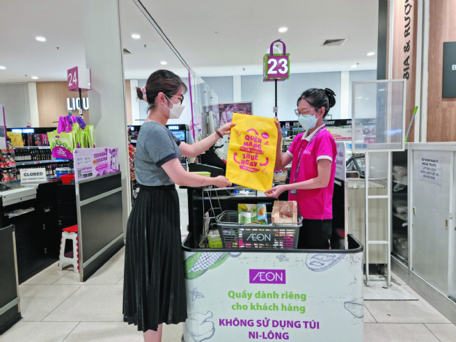 AEON Việt Nam cũng triển khai các sáng kiến như “Rent a bag” - dịch vụ cho khách hàng mượn túi môi trường khi mua sắm với giá chỉ 5.000 đồng/túi, tặng 1.000 đồng trên mỗi hóa đơn “xanh”, hay Greenline - quầy thanh toán ưu tiên cho những khách hàng hưởng ứng thói quen mua sắm và tiêu dùng bền vững. Dự án trên đã và đang tích cực góp phần thúc đẩy việc thay đổi thói quen của nhân viên và khách hàng.