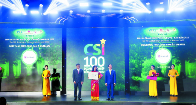 Liên tiếp trong nhiều năm, Ngân hàng TMCP Đông Nam Á (SeABank, mã chứng khoán SSB) được vinh dự được vinh danh trong Top 100 Doanh nghiệp bền vững Việt Nam 2022 (CSI 100) do Hội đồng Doanh nghiệp vì sự Phát triển bền vững Việt Nam (VBCSD), thuộc Liên đoàn Thương mại và Công nghiệp Việt Nam (VCCI) tổ chức và bình chọn. Đây là năm thứ năm SeABank được vinh danh giải thưởng ý nghĩa này. Cộng vào đó là hàng loạt những hoạt động vì cộng đồng, xã hội Seabank đã và đang hướng tới sự phát triển bền vững toàn diện.