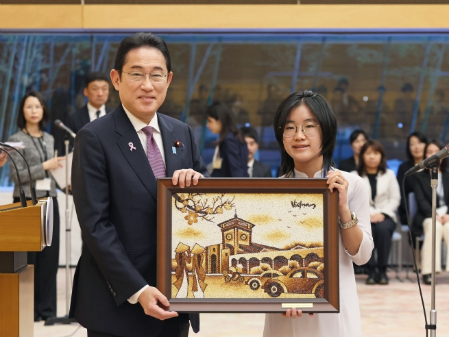 Thủ tướng Nhật Bản Fumio Kishida nhận món quà lưu niệm từ đại diện các em học sinh Việt Nam tham dự chương trình Đại sứ thanh thiếu niên