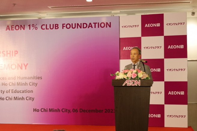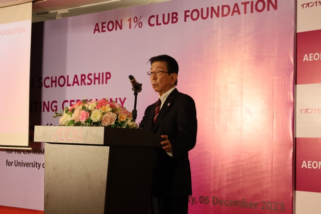Ông Mr. Ono Masuo - Tổng Lãnh Sự Nhật Bản tại thành phố Hồ Chí Minh phát biểu tại buổi Lễ trao học bổng AEON 2023