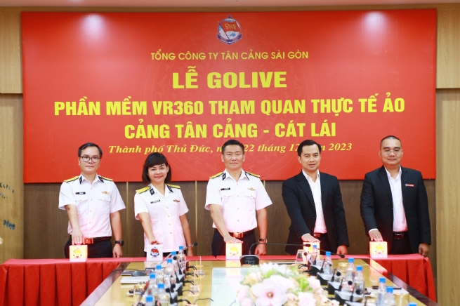Các đại biểu thực hiện nghi thức phát lệnh Golive phần mềm thực tế ảo VR360 cảng Tân Cảng Cát Lái