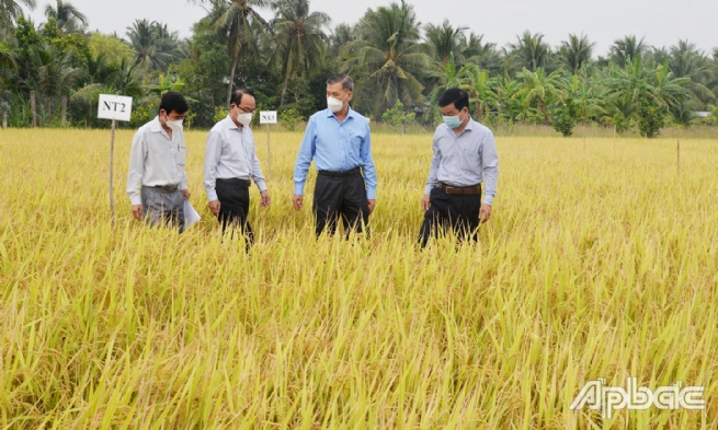 Lãnh đạo Cục Bảo vệ thực vật và Sở Nông nghiệp và Phát triển nông thôn tỉnh Tiền Giang khảo sát mô hình giảm phân bón trong sản xuất lúa