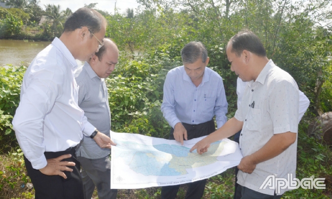 Lãnh đạo Sở Nông nghiệp và Phát triển nông thôn kiểm tra vị trí đắp đập thép ngăn mặn trên sông Phú An