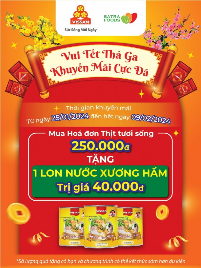 Theo đó, từ ngày 25/01/2024 đến ngày 09/02/2024, quý khách hàng mua sắm thực phẩm tươi sống tại hệ thống cửa hàng giới thiệu sản phẩm VISSAN và các hệ thống siêu thị nêu trên, với mỗi hóa đơn mua hàng thịt tươi sống trị giá 250.000 đồng, quý khách sẽ được tặng 01 sản phẩm Nước Xương Hầm VISSAN 820ml, trị giá 40.000 đồng.