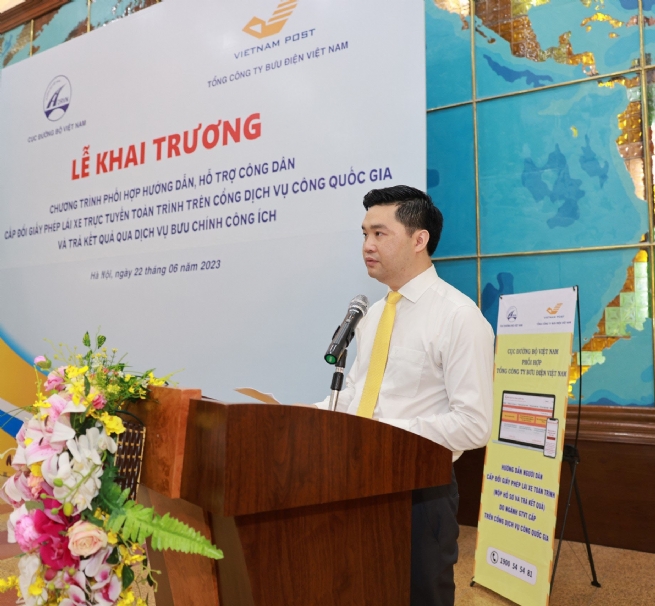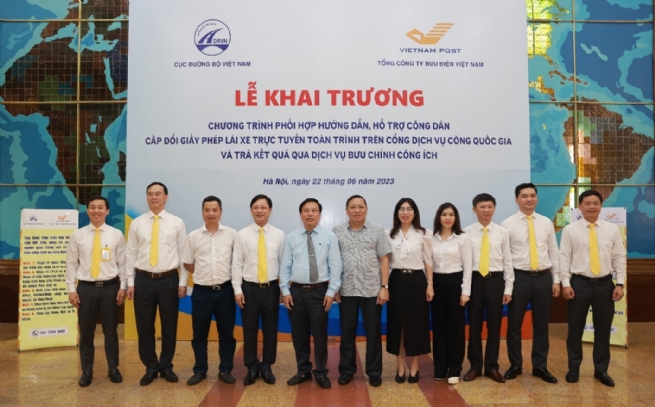 Lãnh đạo Tổng Công ty BĐVN, Bưu điện TPHN và Cục Đường bộ Việt Nam tại Lễ khai trương chương trình phối hợp hướng dẫn, hỗ trợ công dân cấp đổi giấy phép lái xe trực tuyến toàn trình trên cổng dịch vụ công Quốc gia và trả kết quả qua dịch vụ Bưu chính công ích