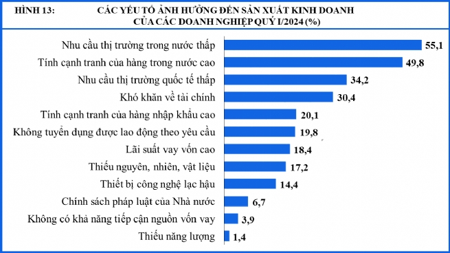 Trong quý 1, hai yếu tố “nhu cầu thị trường trong nước thấp” và “tính cạnh tranh của hàng trong nước cao” vẫn là những yếu tố ảnh hưởng nhiều nhất đến hoạt động sản xuất kinh doanh của doanh nghiệp với tỷ lệ doanh nghiệp lựa chọn lần lượt là 55,1% và 49,8%. Yếu tố “không tuyển dụng được lao động theo yêu cầu” có 19,8% doanh nghiệp lựa chọn - là tỷ lệ lựa chọn cao nhất và tăng nhiều nhất (tăng 3,3%).