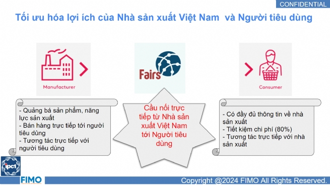 Sàn giao dịch thương mại điện tử Fairs được phát triển với sứ mệnh và tầm nhìn như sau: (1) Hoạt động theo mô hình D2C (Direct to Consumer): là Cầu nối trực tiếp từ Nhà sản xuất Việt Nam tới Người tiêu dùng; (2) Đồng hành cùng nhà sản xuất Việt Nam; (3) Tối ưu hóa lợi ích của Nhà sản xuất Việt Nam và Người tiêu dùng; (4) Phi lợi nhuận. Tại thời điểm ra mắt, Sàn giao dịch Fairs có các sản phẩm được bình chọn là sản phẩm công nghiệp nông thôn tiêu biểu cấp quốc gia các năm 2017, 2019, 2021, 2023 do Bộ Công thương tổ chức bình chọn. Các sản phẩm này đến từ 480 cơ sở sản xuất công nghiệp nông thôn từ khắp 63 tỉnh thành trên toàn quốc. Tham gia sàn Fairs rất đơn giản, các nhà sản xuất đăng ký tài khoản trên sàn; nhập thông tin sản phẩm; các chứng nhận đạt được; thông tin chi tiết về nhà sản xuất. Trên sàn không có trung gian nên nhà sản xuất, doanh nghiệp cần có nhân viên chuyên bán hàng hoặc cộng tác viên bán hàng để cập nhật thông tin của sản phẩm và năng lực sản xuất của mình. Sau khi có người mua, nhà sản xuất sẽ trực tiếp liên hệ, thanh toán, giao hàng tới người tiêu dùng. Sàn giao dịch Fairs không thu bất kỳ một loại phí nào liên quan đến sản phẩm, đơn hàng.