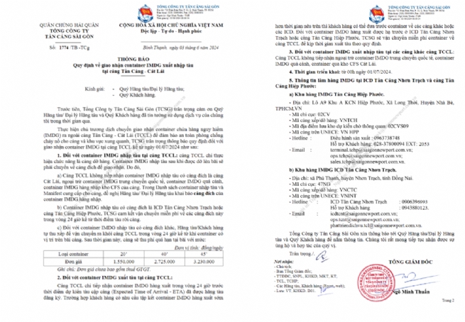 Quy định đối với giao nhận container IMDG xuất nhập tại cảng TCCL kể từ ngày 01/07/2024