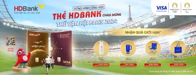 Nổi bật trong loạt ưu đãi mà HDBank đang triển khai là chương trình “Thẻ HDBank Visa Chào mừng Thế vận hội Paris 2024” mang đến những quà tặng đặc biệt cho khách hàng. Thời gian diễn ra chương trình ở Thành phố Hồ Chí Minh từ ngày 07/6 đến ngày 31/10/2024, các tỉnh thành khác từ ngày 01/6 đến ngày 31/10/2024.