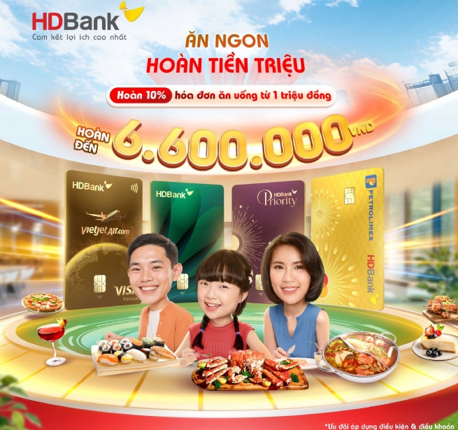 Là tín đồ ẩm thực? HDBank mang đến chương trình ĂN NGON HOÀN TIỀN TRIỆU, hoàn tiền 10% tối đa 300.000 đồng đồng thời giảm trực tiếp thêm đến 20% khi dùng thẻ HDBank.