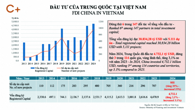 Theo số liệu vừa được Bộ Kế hoạch – Đầu tư công bố, dòng vốn FDI Trung Quốc trong năm 2024 đứng đầu về số dự án cấp mới tại Việt Nam và đứng thứ 3 theo giá trị đầu tư đăng ký mới. Luỹ kế đến hết năm 2024, các dự án FDI Trung Quốc đứng thứ 6; nếu tính luôn cả Hồng Kông (Trung Quốc) sẽ đứng thứ 4, chỉ sau Hàn Quốc, Singapore và Nhật Bản.