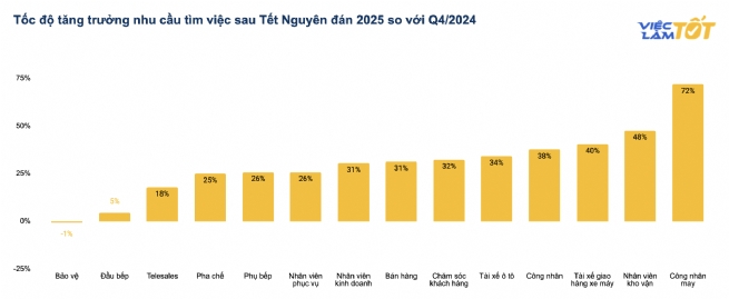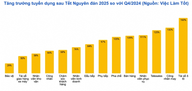 Sau kỳ nghỉ Tết Nguyên Đán, thị trường lao động tại TP.HCM trở nên sôi động hơn bao giờ hết. Nhu cầu tuyển dụng không chỉ tăng mạnh nhằm bù đắp lượng lao động nghỉ việc mà còn phản ánh sự phục hồi tích cực của nền kinh tế. Theo dữ liệu từ Việc Làm Tốt, sau Tết 2025, nhu cầu tuyển dụng tăng 80% so với trung bình quý 4/2024 và cao hơn 14% so với cùng kỳ năm trước. Các ngành có nhu cầu nhân sự lớn bao gồm bán hàng, dịch vụ khách hàng, vận hành sản xuất, thương mại - dịch vụ và logistics. Đáng chú ý, các vị trí như tài xế ô tô, công nhân may, nhân viên kinh doanh, telesales và nhân viên phục vụ nhà hàng ghi nhận mức tăng mạnh nhất, từ 76% đến 160%.