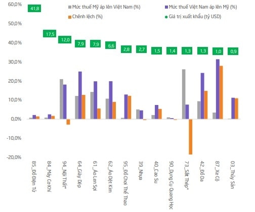Chênh lệch thuế giữa Việt Nam và Mỹ ở các mặt hàng Việt Nam xuất khẩu > 1 tỷ USD - Nguồn: TPS Research.