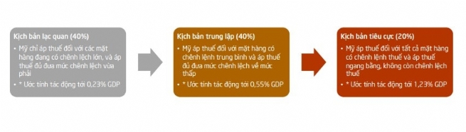 Kịch bản 1 - Kịch bản lạc quan (40%): Mỹ đánh thuế vừa phải lên các mặt hàng có chênh lệch thuế lớn. Đây là kịch bản được đánh giá là khả thi và có tính chọn lọc cao, khi Mỹ nhiều khả năng tập trung vào các mặt hàng có chênh lệch thuế quan rõ rệt nhất. Trong trường hợp này, các nhóm hàng như giày dép (HS 64) với chênh lệch12,8% và kim ngạch 7,9 tỷ USD, đồ chơi thể thao (HS 95) với 12,3%, và thủy sản (HS 03) với 11,0% sẽ trở thành đối tượng bị nhắm đến. Tổng giá trị xuất khẩu của nhóm này vượt 20 tỷ USD, chiếm tỷ trọng đáng kể trong tổng kim ngạch xuất khẩu sang Mỹ, do đó tác động sẽ mạnh về quy mô, nhưng vẫn giới hạn ở một số ngành cụ thể. Đồng thời kỳ vọng mức độ đánh thuế sẽ ở mức vừa phải làm giảm chênh lệch. Đây là kịch bản phản ánh xu hướng "đánh thuế có mục tiêu" mà Mỹ từng áp dụng trong giai đoạn xung đột thương mại với Trung Quốc. Ước tính tác động tới 0,23% GDP.