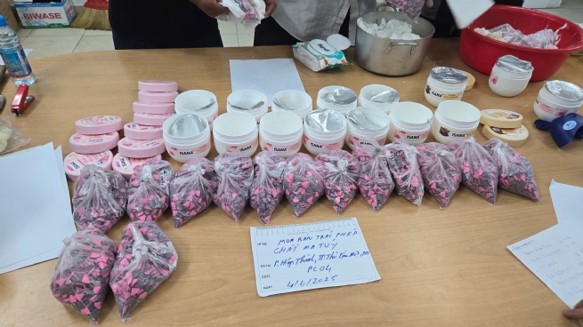 Trước đó, ngày 08/4/2025, bằng các biện pháp nghiệp vụ, Chi cục Hải quan khu vực I đã phối hợp với các lực lượng chức năng phát hiện lô hàng từ Đức về Mỹ Đình qua đường hàng không nghi vấn có chứa ma túy. Qua theo dõi, cơ quan chức năng đã bắt quả tang Đoàn Vũ Anh Hoàng (SN 1993, quê Bình Phước, chỗ ở hiện nay: Khu dân cư Hiệp Thành I, phường Hiệp Thành, TP Thủ Dầu Một, tỉnh Bình Dương) có hành vi vận chuyển thùng hàng chứa 15,8 kg ma tuý tổng hợp (thuốc lắc dạng viên) được nguỵ trang trong các túi bánh kẹo, chai đựng mỹ phẩm,… Khám xét khẩn cấp nơi ở của Đoàn Vũ Anh Hoàng, lực lượng chức năng thu giữ 1 hũ nhựa màu trắng bên trong đựng tinh thể màu trắng và một số dụng cụ có liên quan hoạt động mua bán trái phép chất ma túy. Hiện vụ việc đang được điều tra, xử lý theo quy định của pháp luật.
