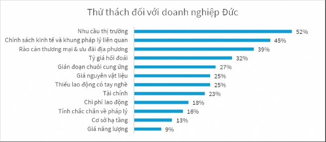 Chỉ ra những thách thức, Báo cáo cho biết, tuy không bị ảnh hưởng trực tiếp từ sự sụt giảm nhu cầu tại Mỹ, nhưng các doanh nghiệp Đức tại Việt Nam vẫn chịu tác động gián tiếp do phụ thuộc vào đối tác phục vụ thị trường này, gây khó khăn trong dự báo và kế hoạch mở rộng, nhất là trong sản xuất và thương mại. Cùng với đó là những thay đổi chính sách; hệ thống pháp lý chưa rõ ràng; giá nguyên vật liệu thô tăng cao kể từ sau đại dịch.