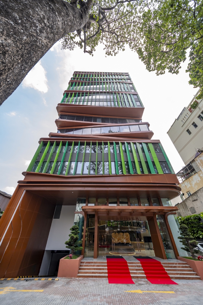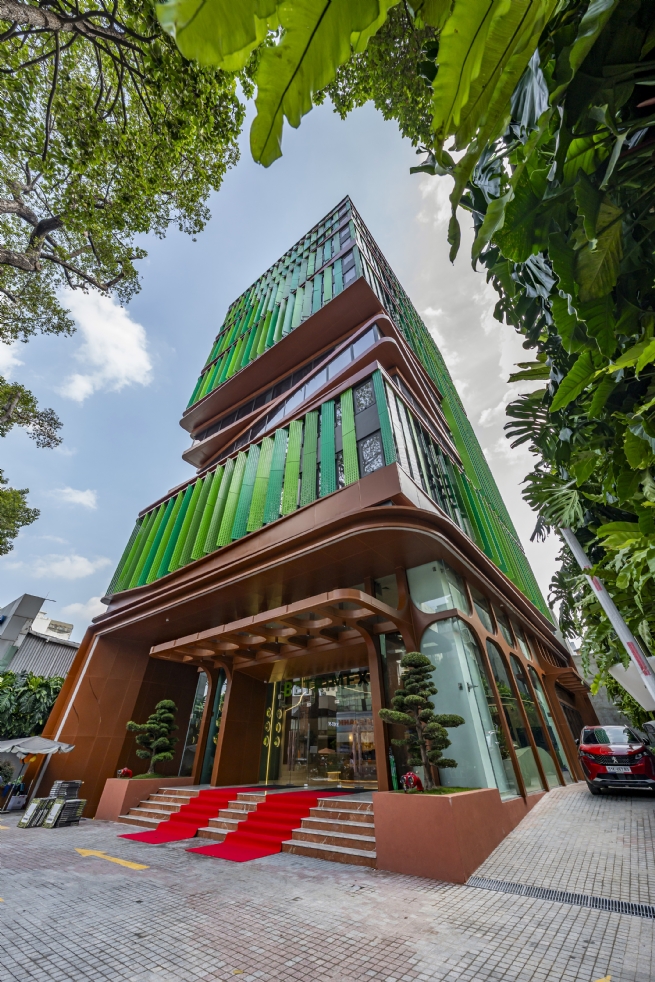 Điểm đặc biệt tạo ấn tượng mạnh mẽ cho tòa nhà không chỉ nằm ở các tiêu chí xanh hướng đến sự bền vững mà còn ở thiết kế mặt đứng và không gian văn phòng sáng tạo, mang đậm tính biểu tượng. Mặt tiền tòa nhà nổi bật với hệ lam đứng màu xanh, gợi liên tưởng đến hình ảnh những tàu lá dừa mềm mại. Sự thay đổi tinh tế trong độ nghiêng và khoảng cách giữa các lớp lam tạo nên hiệu ứng ánh sáng độc đáo, đồng thời mang lại vẻ đẹp tự nhiên và mềm mại cho công trình. Thiết kế này không chỉ có giá trị thẩm mỹ cao mà còn đóng vai trò quan trọng trong việc kiểm soát lượng ánh nắng mặt trời chiếu vào, giảm nhiệt độ bên trong tòa nhà và tăng cường thông gió tự nhiên. Các không gian đệm và khu vực cây xanh được bố trí một cách hài hòa, xen kẽ, tạo ra một môi trường làm việc gần gũi với thiên nhiên, thúc đẩy sự thoải mái và nâng cao hiệu suất làm việc.