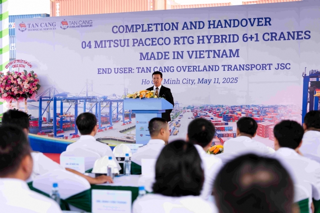Phát biểu tại lễ bàn giao, Thượng tá Phạm Việt Hùng - Giám đốc Công ty cổ phần Dịch vụ Kỹ thuật Tân Cảng, khẳng định việc lắp đặt và đưa vào khai thác 4 cẩu RTG Hybrid tại Cát Lái là bước tiến quan trọng trong hành trình hiện thực hóa mục tiêu cảng xanh, giảm phát thải và nâng cao hiệu quả vận hành. Công ty Dịch vụ Kỹ thuật Tân Cảng tự hào đóng góp vào thành công này bằng sự nỗ lực không ngừng của đội ngũ kỹ sư và chuyên viên kỹ thuật.