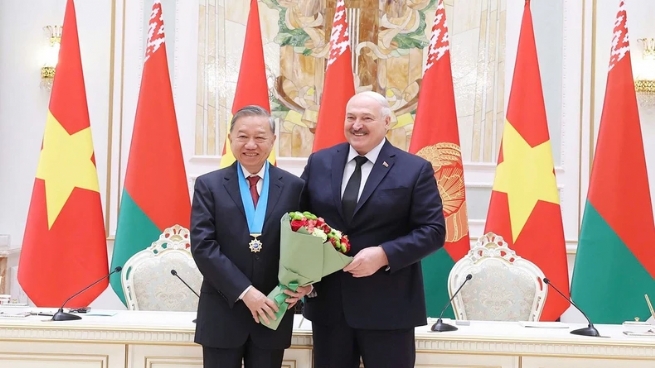 Tổng thống Belarus Aleksandr Lukashenko trao Huân chương Hữu nghị các dân tộc của Belarus tặng Tổng Bí thư Tô Lâm. (Ảnh: TTXVN)