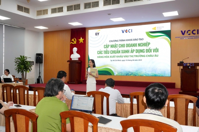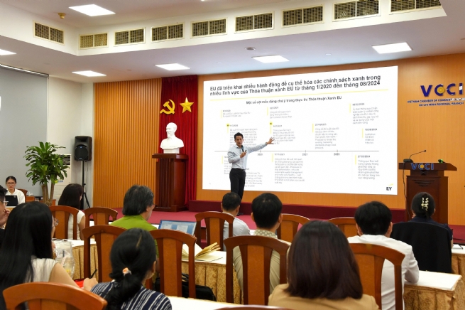 Trước thực tế đó, Liên đoàn Thương mại và Công nghiệp Việt Nam (VCCI), với sự hỗ trợ của các chuyên gia đến từ Ernst & Young Việt Nam (EY Việt Nam) đã tổ chức Khóa đào tạo chuyên sâu “Cập nhật cho doanh nghiệp các tiêu chuẩn xanh áp dụng đối với hàng hóa xuất khẩu vào thị trường Châu Âu” tại TP. Hồ Chí Minh cho đông đảo lãnh đạo và đại diện doanh nghiệp.