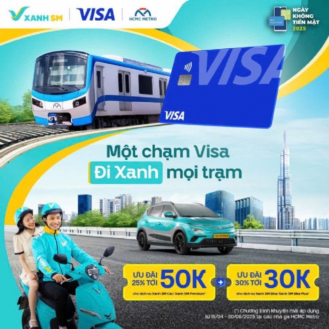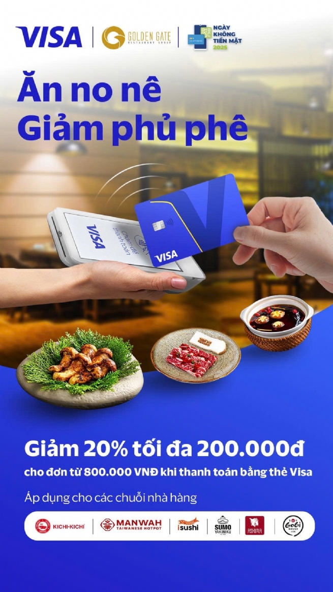 Hưởng ứng Chương trình khuyến mại tập trung quốc gia 2025 (ngày 14/6 – 14/7) của Bộ Công Thương, Visa mang đến hàng loạt chương trình khuyến mãi hấp dẫn. Ưu đãi nổi bật bao gồm ưu đãi 20% khi thanh toán bằng thẻ Visa với 6 thương hiệu của chuỗi nhà hàng Golden Gate, giảm giá tại các cửa hàng thương hiệu ACFC, ưu đãi đặt Be, Grab, và Xanh SM đưa đón mọi trạm thuộc Tuyến Metro Số 1 TP. Hồ Chí Minh.