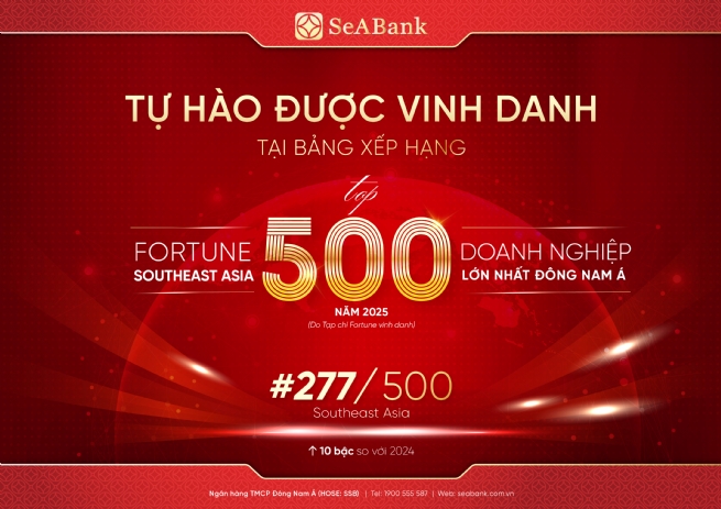 Năm 2025, Ngân hàng TMCP Đông Nam Á (SeABank, HOSE: SSB) tiếp tục được Tạp chí kinh doanh Fortune (Hoa Kỳ) vinh danh trong bảng xếp hạng Fortune Southeast Asia 500 - 500 Doanh nghiệp lớn nhất Đông Nam Á với thứ hạng 277/500, tăng 10 bậc so với năm 2024 nhờ hoạt động hiệu quả, giữ vững đà tăng trưởng và vị thế nổi bật trong khu vực.