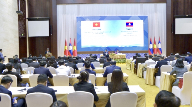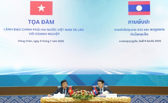 Phó Thủ tướng Nguyễn Chí Dũng (bên trái) và Phó Thủ tướng Lào Saleumxay Kommasith (bên phải) đồng chủ trì Tọa đàm giữa Lãnh đạo Chính phủ hai nước với doanh nghiệp