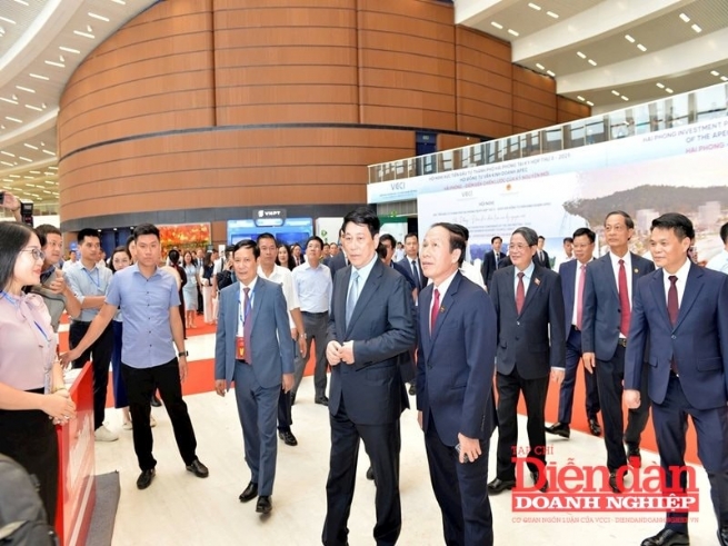 Chủ tịch nước Lương Cường; Bí thư Thành uỷ Hải Phòng Lê Tiến Châu ; Chủ tịch VCCI Phạm Tấn Công... cùng các lãnh đạo bộ ngành thăm quan các gian hàng của các doanh nghiệp tại Hội nghị Xúc tiến Đầu tư thành phố Hải Phòng trong khuôn khổ Kỳ họp thứ 3-2025 Hội đồng Tư vấn kinh doanh (ABAC III)
