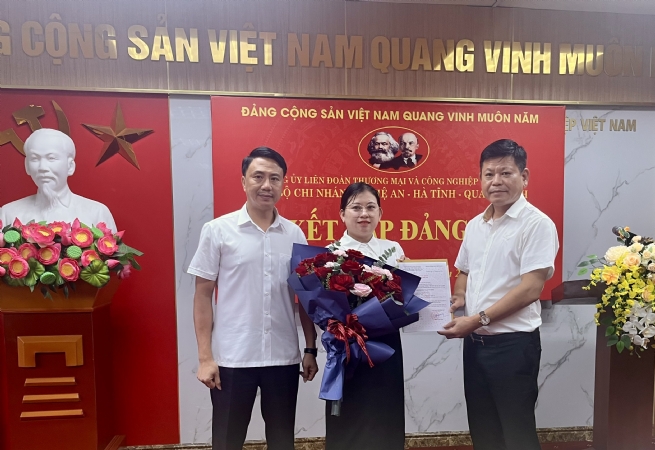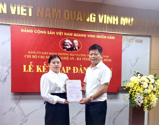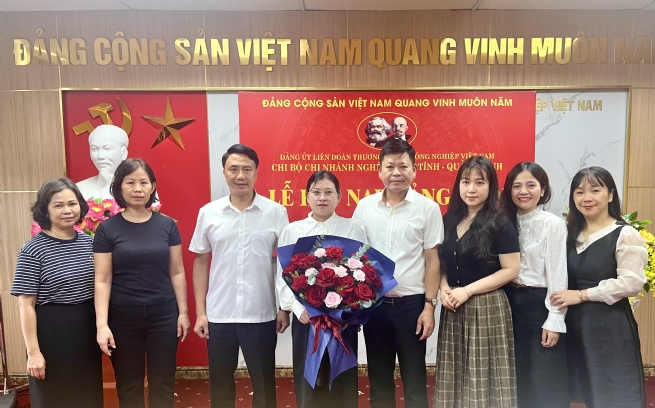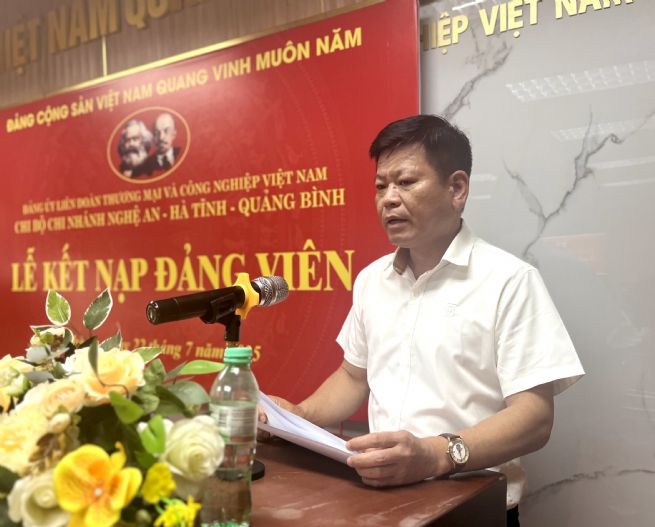 Ngày 22/7/2025, được sự đồng ý của Đảng ủy Liên đoàn Thương mại và Công nghiệp Việt Nam (VCCI), Chi bộ Chi nhánh VCCI Nghệ An – Hà Tĩnh – Quảng Bình tổ chức Lễ kết nạp đảng viên mới cho quần chúng ưu tú Trần Thị Mai, phụ trách Phòng Kế toán. Tham dự Lễ kết nạp có đồng chí Bùi Xuân Sinh – Bí thư Chi bộ, Giám đốc Chi nhánh; đồng chí Lê Nguyễn Chung – Phó Giám đốc; đồng chí Phan Duy Hùng – Chủ tịch Công đoàn, cùng toàn thể đảng viên thuộc Chi bộ Chi nhánh.
