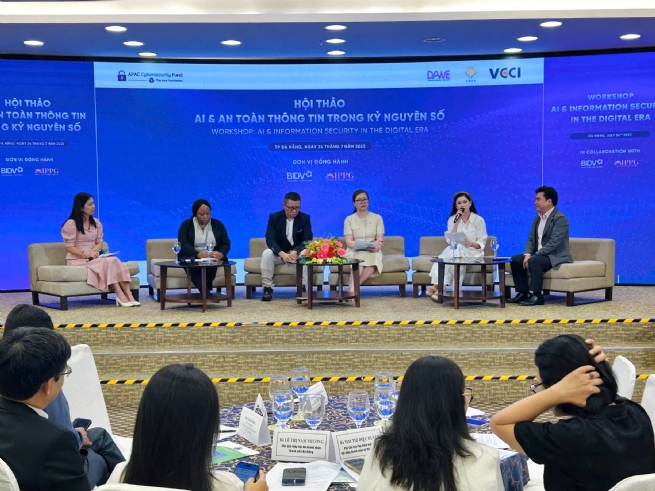 Phiên thảo luận với chủ đề “Ứng dụng AI và đảm bảo an toàn thông tin trong hoạt động doanh nghiệp” với sự tham gia và chia sẻ của các diễn giả, chuyên gia từ UN Women, BIDV, Tập đoàn IPPG; Viện Công nghệ Blockchain và Trí tuệ nhân tạo ABAII; CLB Giám Đốc Sales & Marketing Việt Nam - CSMO Vietnam, đã thảo luận cụ thể về những thách thức trong ứng dụng AI đến việc quản lý rủi ro an toàn thông tin của doanh nghiệp, việc đổi mới tư duy quản trị và nâng cao năng lực lãnh đạo doanh nghiệp trong kỷ nguyên số, đặc biệt là đối với các doanh nghiệp do phụ nữ làm chủ, lãnh đạo. Những câu chuyện thực tiễn và kinh nghiệm được chia sẻ của các nữ lãnh đạo và các chuyên gia, khách mời đã truyền cảm hứng cho các nữ doanh nhân tham dự hội thảo về tinh thần đổi mới sáng tạo, chủ động ứng dụng công nghệ số một cách an toàn để dẫn dắt doanh nghiệp phát triển trong bối cảnh mới.