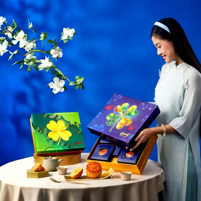 Hộp Hy Vọng – Lưu dấu ước mơ qua từng mùa trăng: Nét mộc mạc của hộp gỗ nâu kết hợp ánh xanh kim của cỏ bốn lá tạo nên biểu tượng của niềm tin. Bốn chiếc bánh là vị ngọt đoàn viên, là lời gửi gắm cho những điều tốt lành phía trước – nơi hy vọng luôn hiện diện trong từng mùa trăng.