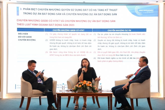 Theo ông Lý, các hạn chế này thể hiện ở nhiều khía cạnh. Trước hết, khái niệm “kinh doanh QSDĐ có hạ tầng kỹ thuật” chưa được định nghĩa cụ thể, khiến hoạt động này dễ bị lẫn với các hình thức kinh doanh bất động sản khác, đặc biệt là chuyển nhượng dự án. Bên cạnh đó, pháp luật cũng chưa quy định rõ ràng về tư cách chủ đầu tư của bên nhận chuyển nhượng QSDĐ đã có hạ tầng kỹ thuật. Từ đây, vấn đề kế thừa quyền và các nghĩa vụ liên quan từ bên chuyển nhượng sang bên nhận chuyển nhượng cũng còn chưa được làm rõ, gây khó khăn trong việc tiếp nối triển khai dự án. Đồng tình với những phân tích của LS. Lương Văn Lý, LS. Nguyễn Trúc Hiền cho biết, pháp luật chưa phân định rõ ràng giữa chuyển nhượng QSDĐ đã có hạ tầng kỹ thuật cho tổ chức và chuyển nhượng toàn bộ hoặc một phần dự án bất động sản, dẫn đến lúng túng trong quản lý nhà nước, cũng như tiềm ẩn rủi ro cho các bên tham gia giao dịch. Theo bà Hiền, về bản chất pháp lý, chuyển nhượng QSDĐ có HTKT chỉ đề cập đến việc chuyển quyền sử dụng đất đã hoàn thiện hạ tầng kỹ thuật để bên nhận chuyển nhượng có thể tự xây dựng theo mục đích đã được duyệt và tuân thủ các điều kiện. Trong khi đó, chuyển nhượng dự án bất động sản là việc chủ đầu tư chuyển giao toàn bộ hoặc một phần dự án, bao gồm cả quyền, nghĩa vụ và trách nhiệm liên quan đến dự án đó.