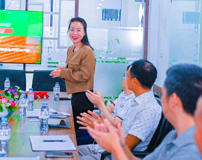 Bà Lê Bích Trang tại buổi training 2 sản phẩm mới: ống chữa cháy công nghệ không hàn cắt và miếng dán Novec 1320 chữa cháy chủ động cho pin Lithium (Công ty Hoàng Quân Phát là đại lý độc quyền khu vực miền Nam)