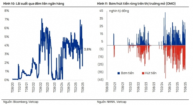 Nhìn lại tháng 8, theo Chứng khoán Vietcap, NHNN thắt chặt thanh khoản liên ngân hàng vào đầu tháng 8, với lãi suất liên ngân hàng qua đêm tăng mạnh lên 6,1% vào ngày 08/08 trước khi hạ nhiệt xuống 3,8% vào cuối tháng 8 (tăng 73 điểm cơ bản MoM).