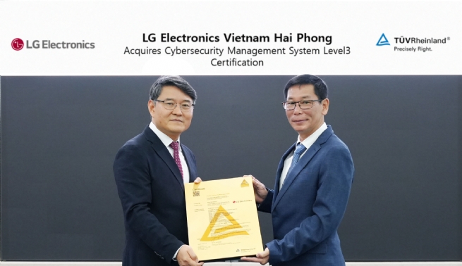 Trong bối cảnh đó, LG đã triển khai Hệ thống Quản lý An ninh mạng (CSMS) toàn diện tại nhà máy Hải Phòng, bao gồm phát hiện mối đe dọa theo thời gian thực, thực hành phát triển phần mềm an toàn và đánh giá lỗ hổng nghiêm ngặt. Với việc thắt chặt an ninh mạng trên tất cả các lĩnh vực, nhà máy tại Hải Phòng đã vinh dự đạt chứng nhận Hệ thống Quản lý An toàn An ninh mạng (Cyber Security Management System - CSMS) Cấp độ 3 từ TÜV Rheinland. Điều này khiến đây trở thành cơ sở đầu tiên của LG trên thế giới được TÜV Rheinland chứng nhận đạt đồng thời cả CSMS Cấp độ 2 và Cấp độ 3.