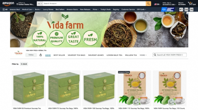 Gian hàng Vida Farm trên Amazon cho thấy nỗ lực của thương hiệu trong việc nâng tầm nông sản Việt, mang đến diện mạo cao cấp và chỉn chu qua từng hình ảnh sản phẩm được đăng tải