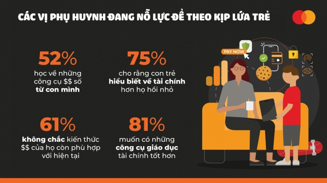 Theo báo cáo của Mastercard, kết quả nghiên cứu cho thấy các bậc phụ huynh Việt Nam nhận thức rõ rằng con mình sẽ lớn lên trong một thế giới tài chính số hóa, nơi việc không sở hữu ví vật lý hay mang theo tiền mặt sẽ trở nên phổ biến. Đáng chú ý, 73% phụ huynh dự đoán con mình có thể sẽ không bao giờ sử dụng ví vật lý hay tiền mặt. Sự thay đổi thế hệ này cũng tạo ra một khoảng cách trong hiểu biết về tài chính: 75% tin rằng con mình hiểu biết về tài chính hơn so với họ ở cùng độ tuổi; 61% không chắc rằng kiến thức tài chính của mình còn phù hợp với thế hệ của các con; 59% thừa nhận con họ biết nhiều về các phương thức thanh toán mới hơn họ; 81% mong muốn có nhiều công cụ hơn để dạy trẻ về tài chính.