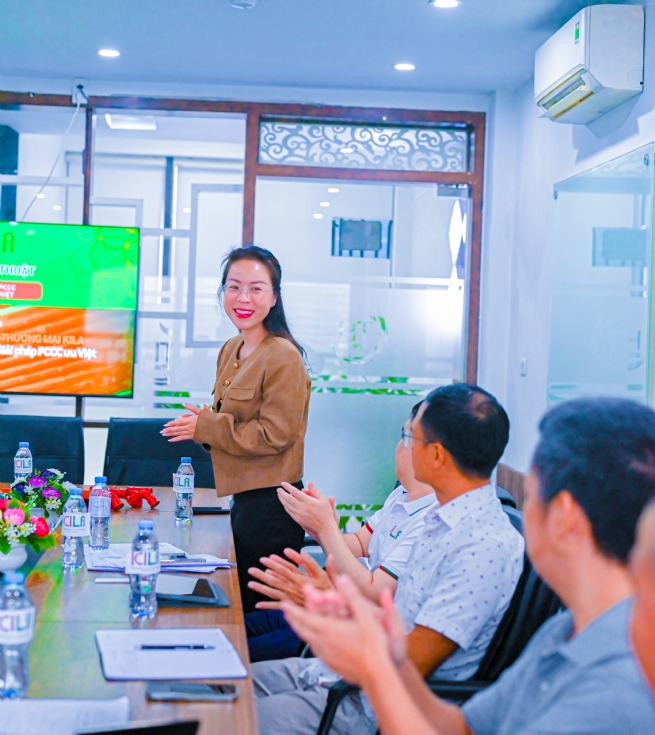 Bà Lê Bích Trang tại buổi training 2 sản phẩm mới: Ống chữa cháy công nghệ không hàn cắt và miếng dán Novec 1320 chữa cháy chủ động cho pin Lithium (Công ty Hoàng Quân Phát là đại lý độc quyền khu vực miền Nam)