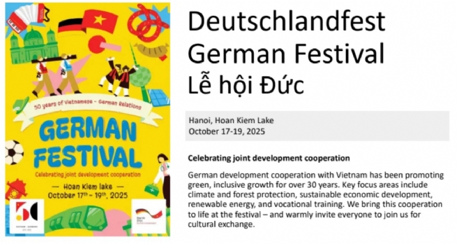 Nhân kỷ niệm 50 năm thiết lập quan hệ ngoại giao giữa Đức và Việt Nam, Lễ hội Đức (Deutschlandfest) sẽ diễn ra từ ngày 17 đến 19 tháng 10 năm 2025 tại khu vực Hồ Hoàn Kiếm. Với chủ đề “Kỷ niệm Hợp tác Phát triển Chung”, lễ hội là một trong những sự kiện điểm nhấn đóng góp vào chuỗi hoạt động tưởng niệm kéo dài suốt năm nhân dịp 5 thập kỷ quan hệ ngoại giao giữa hai nước.