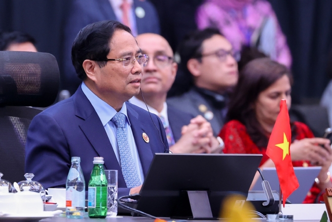Trong bối cảnh thế giới và khu vực tiếp tục có nhiều biến động phức tạp, khó lường, Thủ tướng Chính phủ đề nghị ASEAN không ngừng nỗ lực góp phần duy trì môi trường hoà bình, an ninh, ổn định và phát triển, coi đây là ưu tiên hàng đầu - Ảnh: VGP/Nhật Bắc